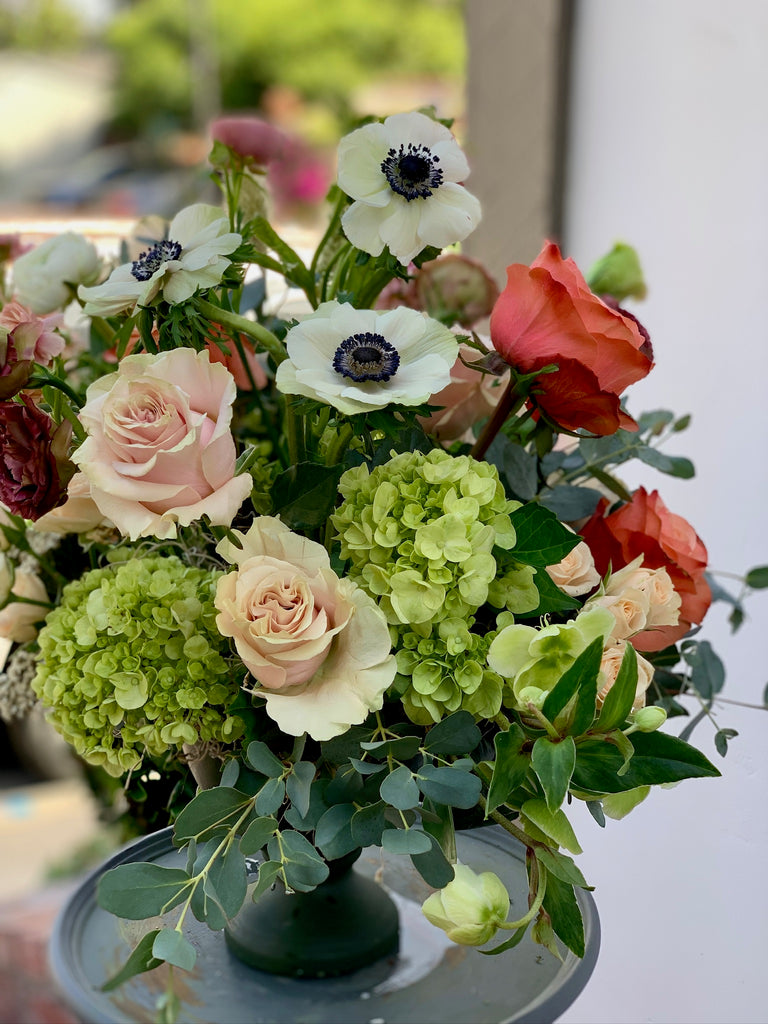 This charming bouquet features a whimsical mix of roses, hydrangea, ranunculus, anemone, and stock, accented with butterfly ranunculus and seasonal filler flowers and foliage. A perfect gift for anyone looking to add a touch of playful beauty to their space!