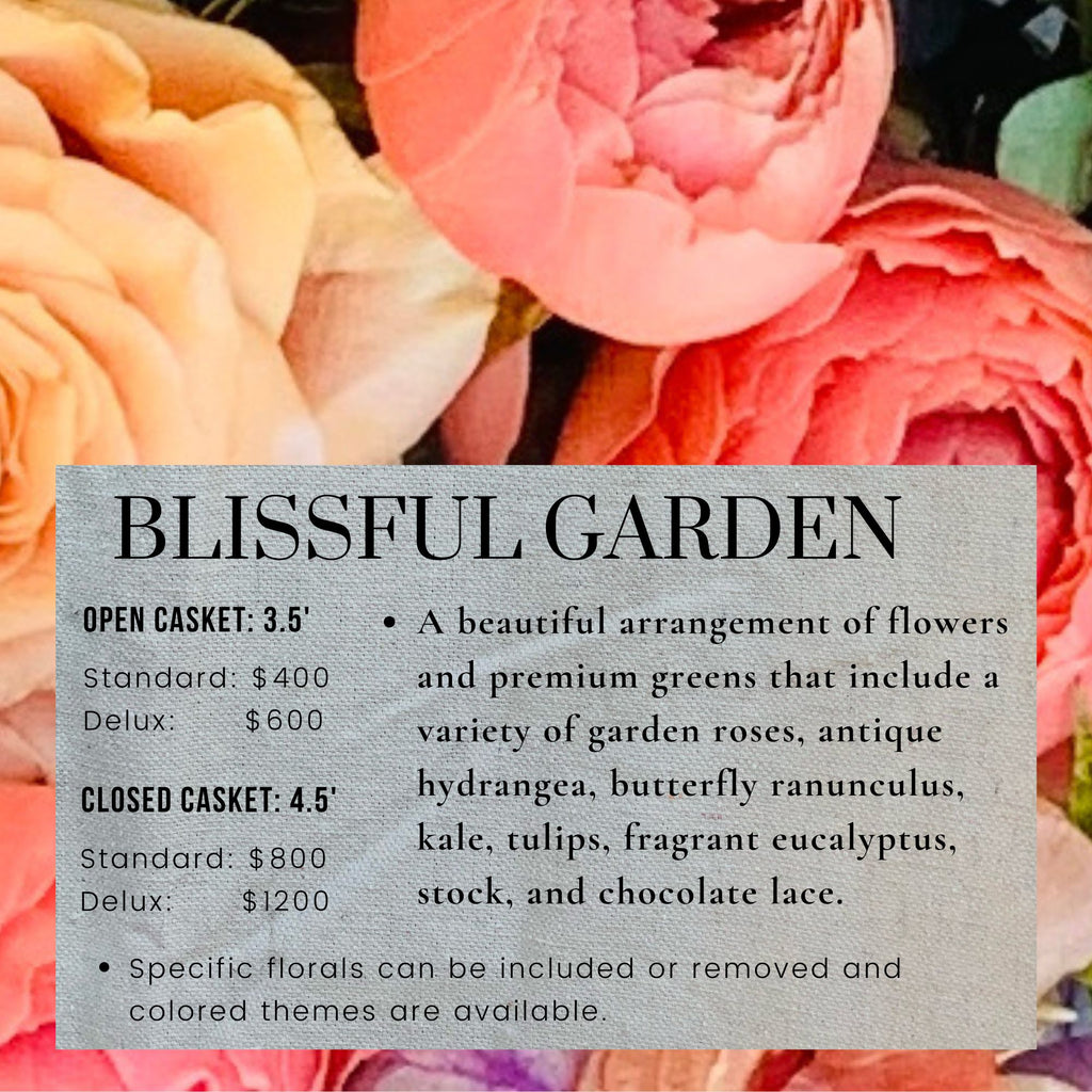 A beautiful arrangement of flowers and premium greens that include a variety of garden roses, antique hydrangea, butterfly ranunculus, kale, tulips, fragrant eucalyptus, stock, and chocolate lace.
