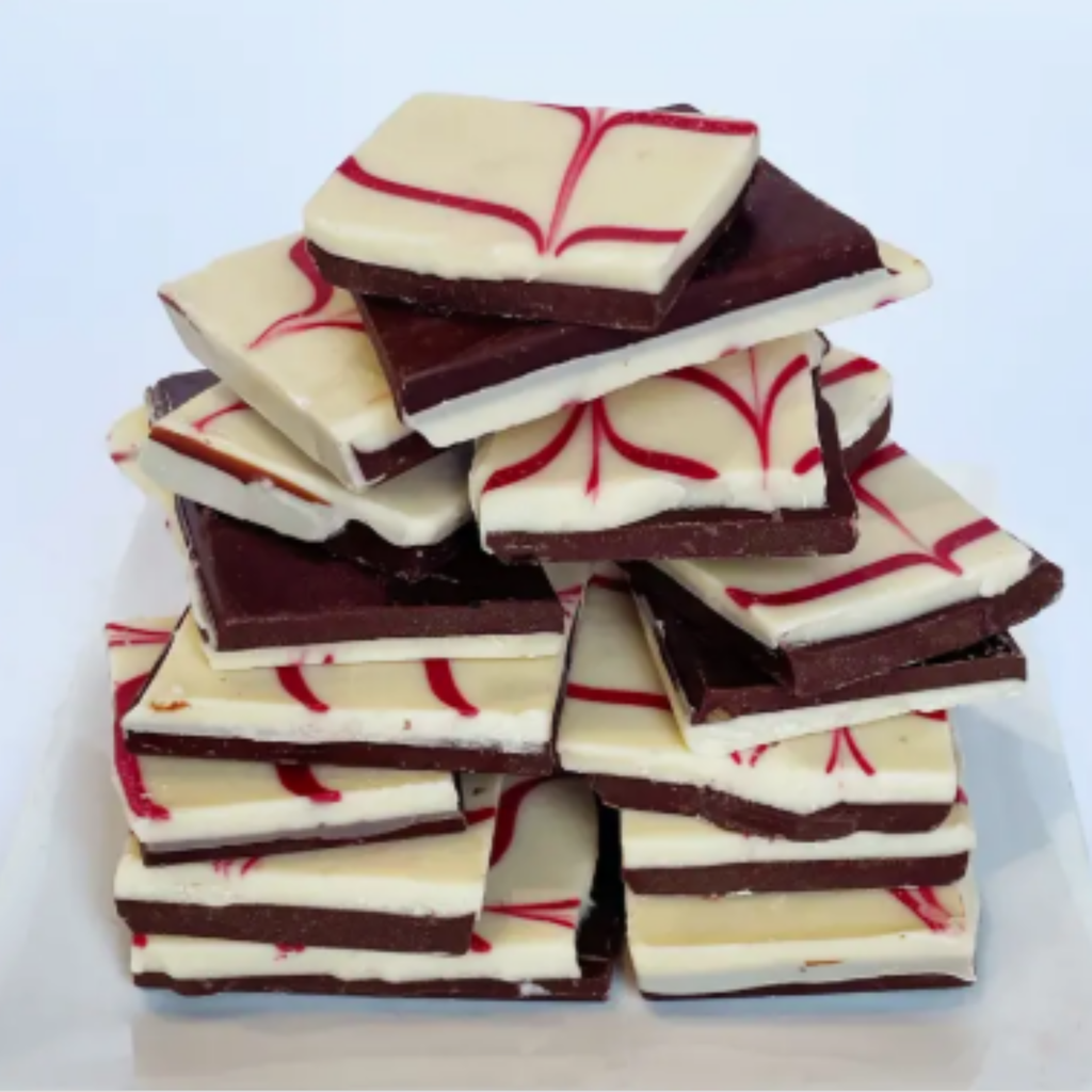 Ingredients - peppermint white chocolate (sugar*, cacao butter*, nonfat dried milk*, butter*, peppermint oil, vanilla), dark chocolate (cacao, sugar*, cacao butter*), peppermint candy (sugar*, tapioca syrup*, baking soda, peppermint oil), naturally colored cacao butter.