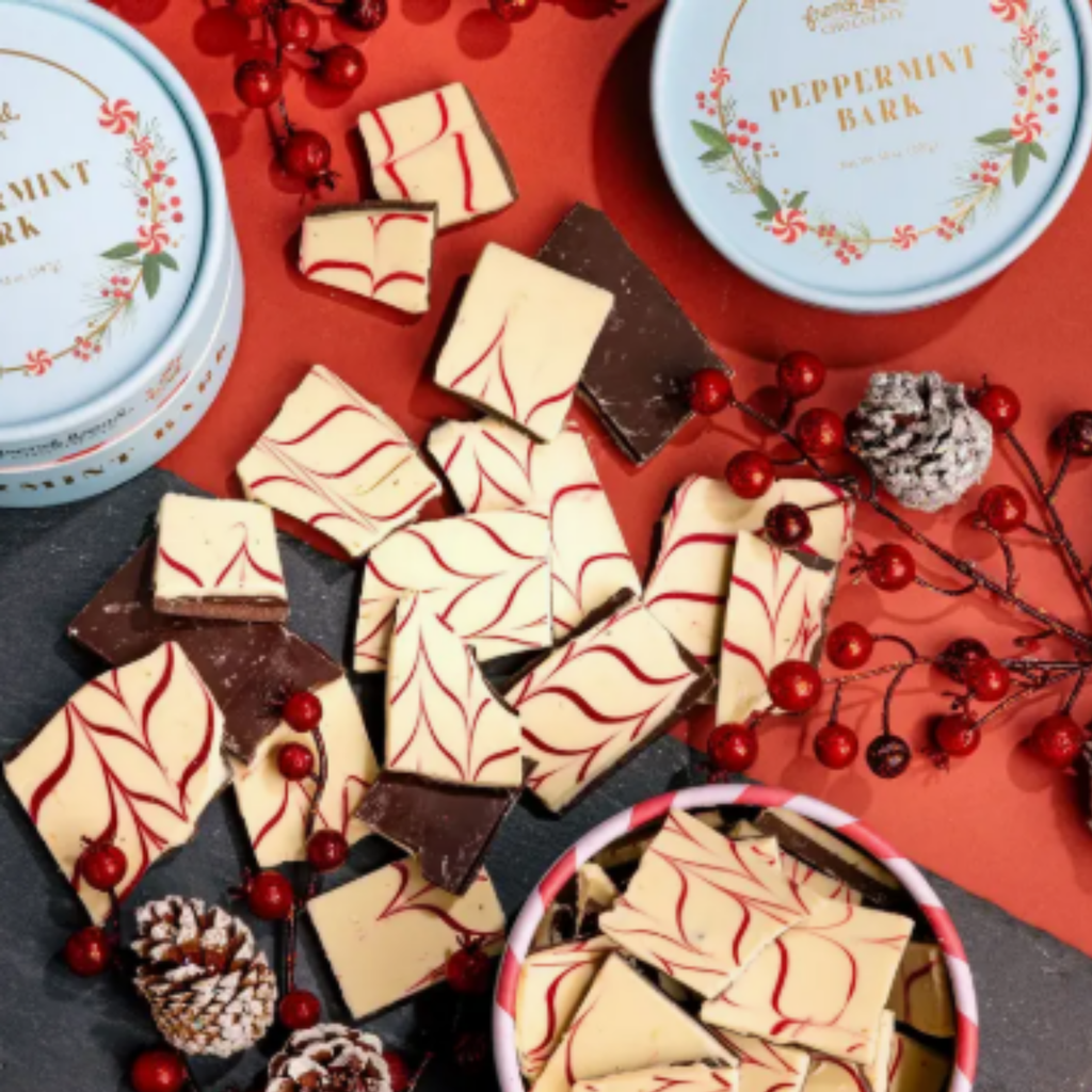 The perfect gift for the holidays, our Peppermint Bark features bean-to-bar dark chocolate sprinkled with peppermint candy and layered with our peppermint white chocolate; presented in a beautiful gold foil stamped package, ready for gifting. Christmas candies can't compare to this handcrafted and luxe holiday gift - 14oz